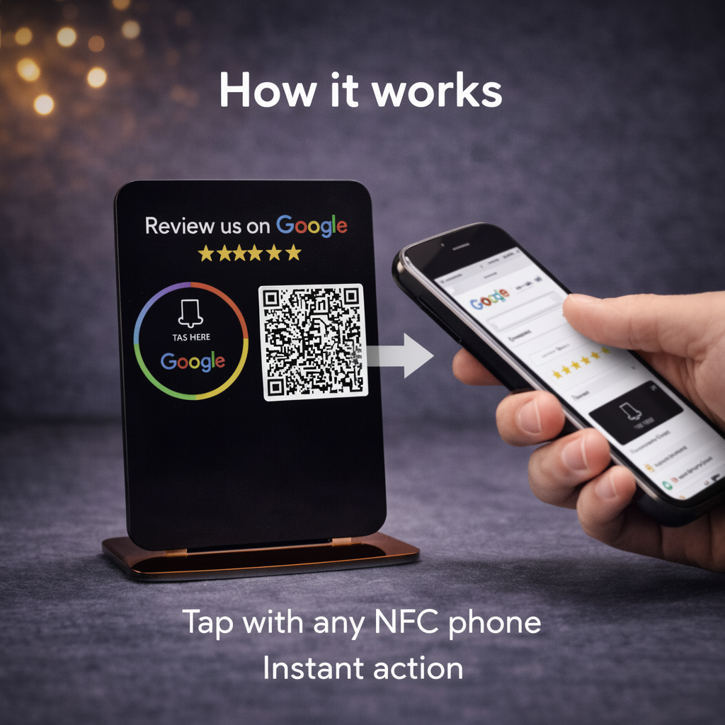 Customers simply tap their NFC-enabled phone on the plaque, and they're instantly directed to your Google review page. It's the most elegant, professional way to build your online reputation and showcase your commitment to customer feedback.